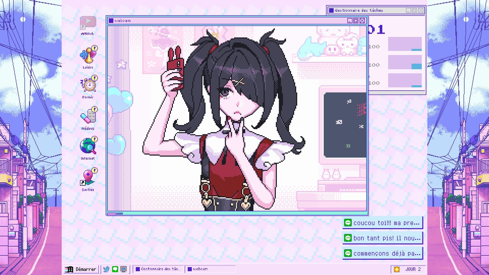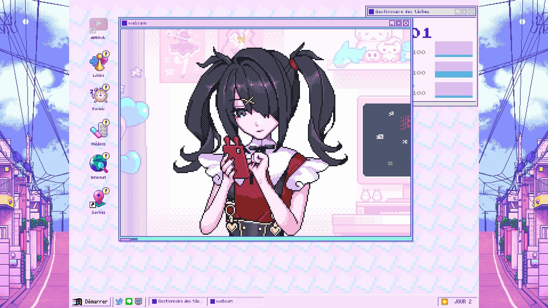 Une fenêtre justement, c'est ce qui va nous permettre d'observer et d'interagir avec Ame, la seule vue qu'on aura d'elle sera via un affichage de sa webcam ou de par un suivi de son compte privé sur les réseaux, on peut alors l'observer, fixement sur sa chaise, se faire les ongles, utiliser son hand-spinner, on peut regarder ses streams évidement, mais on peut aussi observer son comportement, la voir trembler de stress, sourire d'amour ou exploser lors de ses crises.